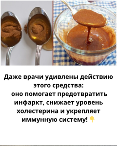? 2 ст. ложки мёда + 3 ч. ложки корицы в стакане воды — поможет снизить холестерин за пару часов.