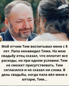 «Моего отчима Тима я знаю с восьми лет. Именно он воспитал меня и всегда был рядом. Но мой отец ненавидел Тима. Когда я собиралась выйти замуж, отец сказал, что оплатит все расходы свадьбы, но только при одном условии: Тим не должен присутствовать.